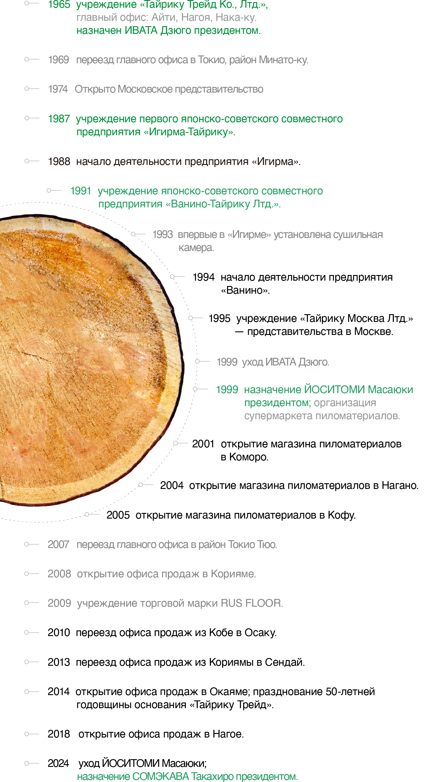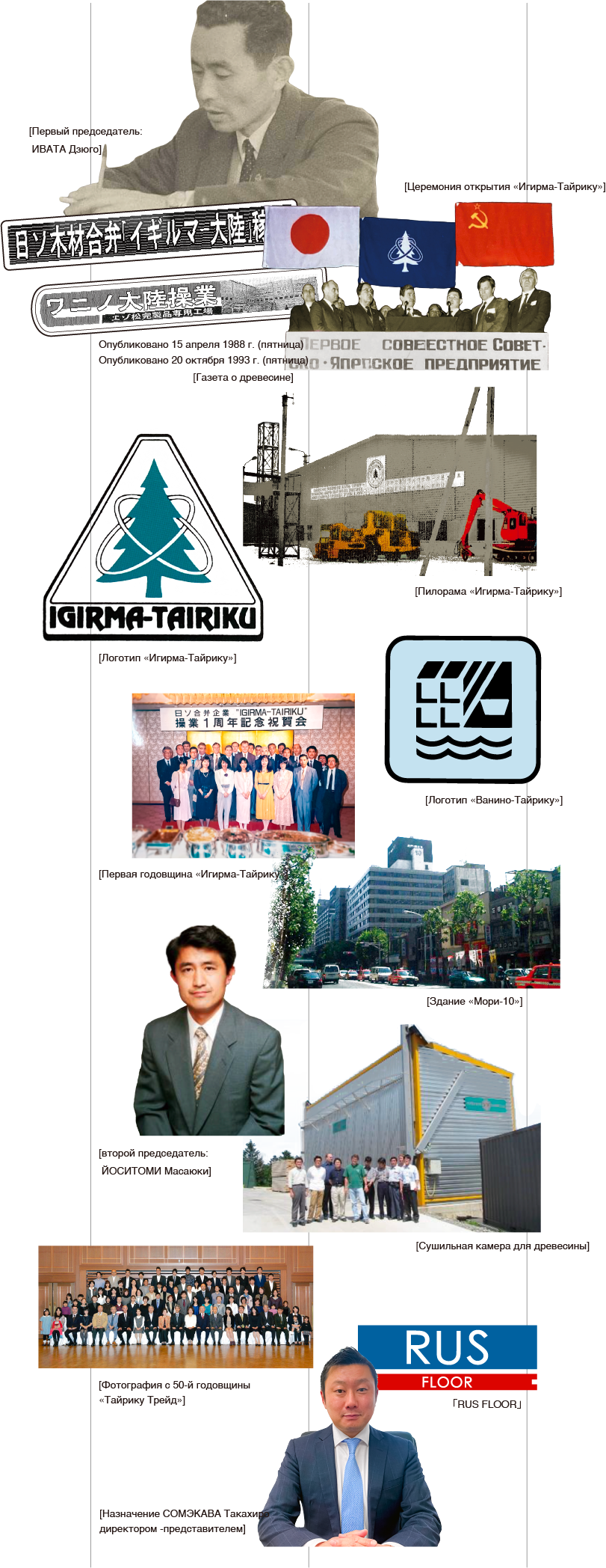 Основатель компании, ИВАТА Дзюго, когда-то был подневольным работником в Сибири и обратил внимание на высочайшее качество сибирской древесины. По возвращении в Японию он основал собственный бизнес, занявшись импортом лесоматериала из России. В 1974 году он открыл офис в Москве, а в 1987 основал первое для Японии совместно предприятие с Советским Союзом. С тех самых пор и вот уже больше полувека наше предприятие ведет торговлю с СССР и (после его распада) с Россией.